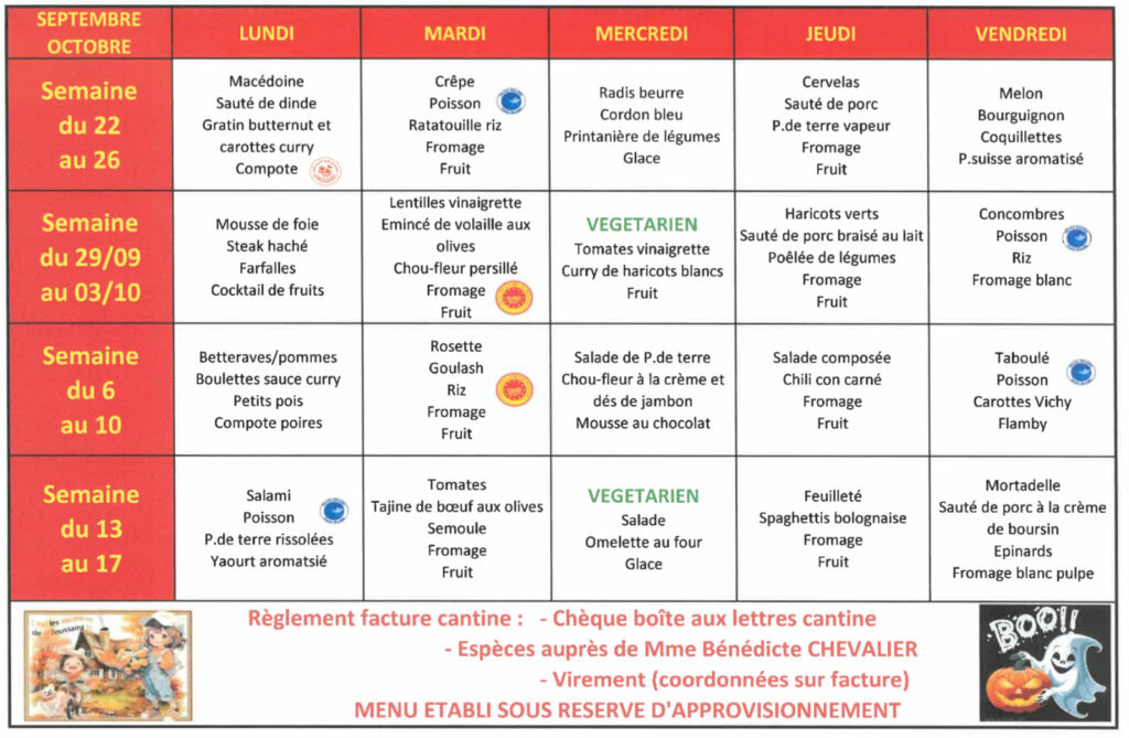 Règlement des factures de cantine -> par virement, chèque à l’ordre du comité de gestion ou en espèces avec la responsable Bénédicte Chevalier. L’inscription au restaurant scolaire se fait sur le Portail Familles.